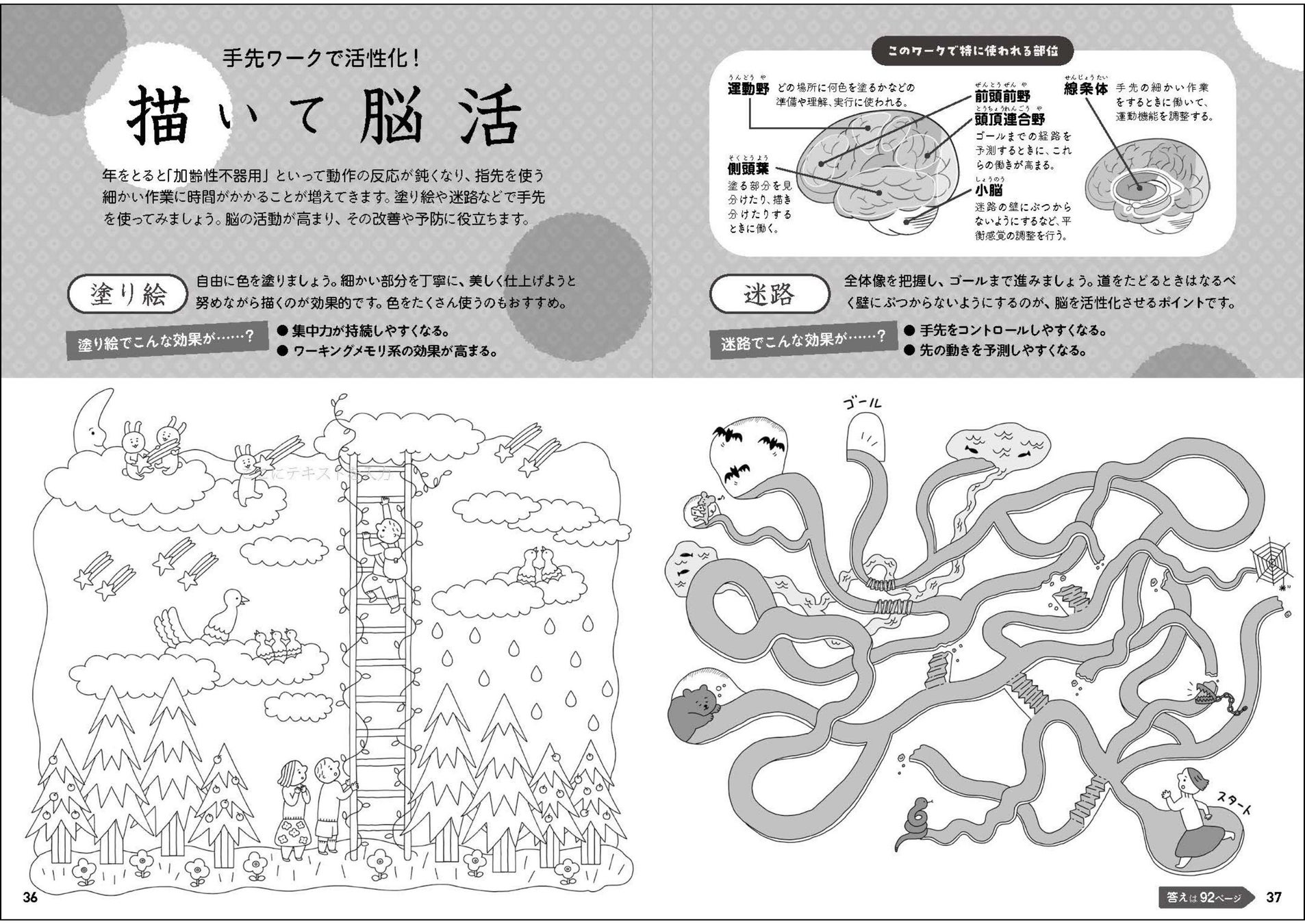 本書には、「言語系」「計算系」「漢字系」「論理・推理系」「視覚認知系」「ワーキングメモリ系」の6分野と、それらを混合させた「MIX系」の「脳活ワーク」を収載。「言語系ワーク」では、言葉を話すときに働く「前頭葉」、記憶の中にある言葉を思い出すときに働く「側頭葉」など、各脳活ワークをすることで、脳のどの部位を活性化させるのかについても、わかりやすく紹介しています。脳のどこを活性化させているのかを意識して取り組むことでやる気もアップし、また、さまざまな脳活ワークにトライすることで、脳の各部位をバランスよく刺激できます。