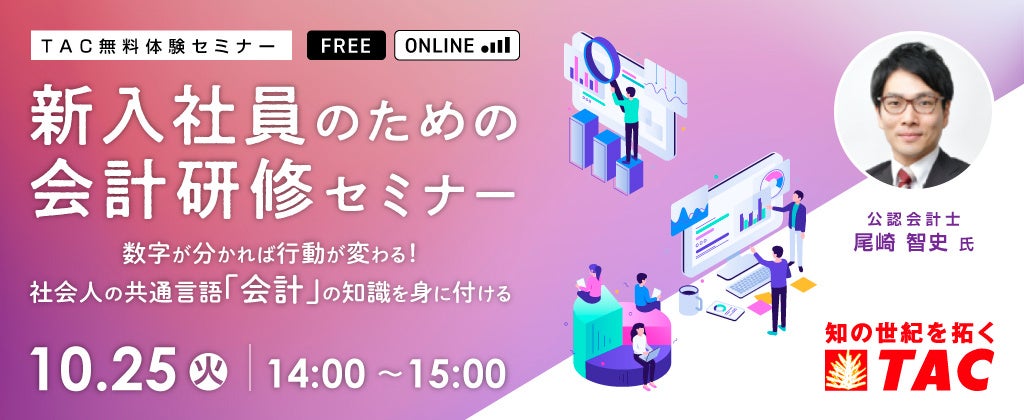 公認会計士や税理士など、多くの国家資格や検定試験の受験指導などの教育事業を展開しているTAC株式会社(東京都千代田区、代表取締役:多田敏男)は、法人向け人材教育部門から、社会人必須のスキルである「会計」について、会計知識を身につける必要性と新人研修に財務研修を導入するメリットについて解説するとともに、公認会計士試験合格者を多数輩出するTACの財務研修コンテンツを体感できるセミナーを2022年10月25日に実施します。