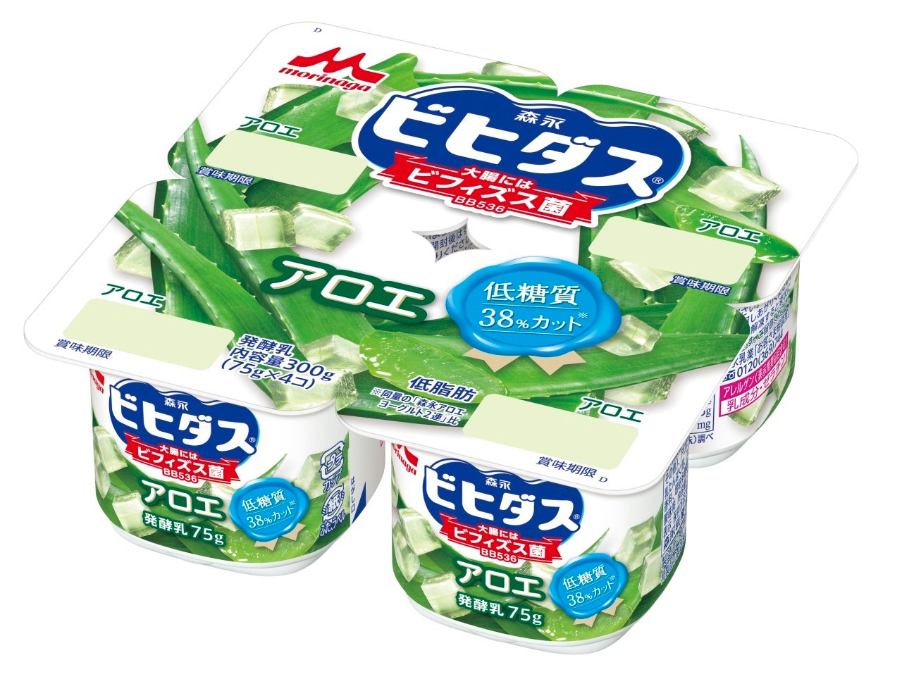 ※1 「アロエ」「バラエティパック」「ストロベリー+ブルーベリーミックス」「白桃+黄桃」は、同量の「森永アロエヨーグルト2連」比で38%カット。「プレーン加糖」は、同量の「ビヒダス プレーンヨーグルト 加糖112g」比で46%カット。