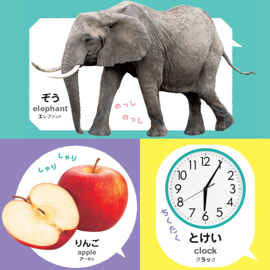 お子さまがモノを認識しやすい、大きな写真とカラフルな背景色。