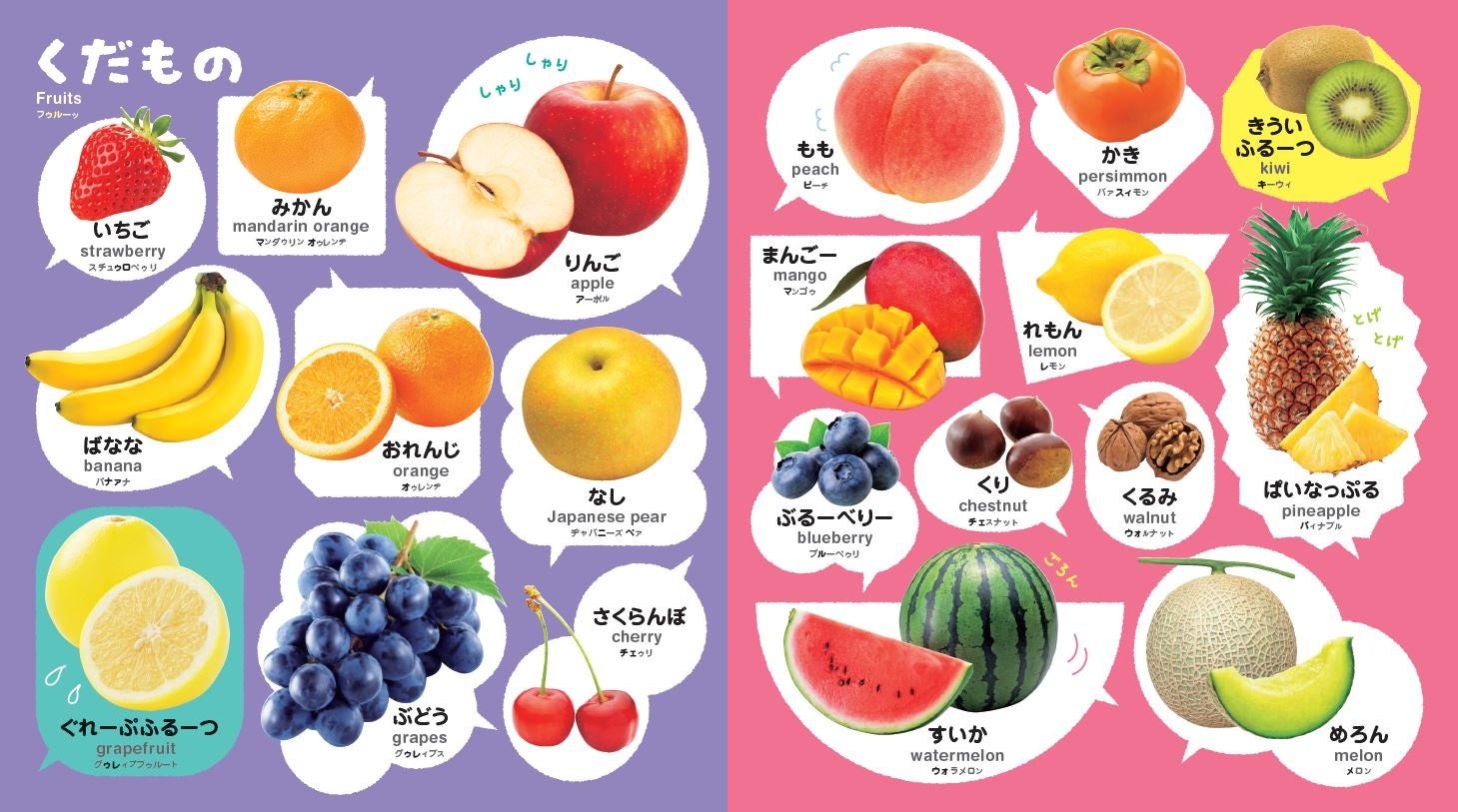 どうぶつ/むし/とり/かわやうみのいきもの/やさい/くだもの/しょくじ/おかし・ぱん/いろいろなたべもの/いえのなか/みじたく/おもちゃ・ゆうぐ/いえのそと/のりもの/きょうりゅう/そら/しょくぶつ/きせつ・ぎょうじ/かお・からだ・かぞく/いろ・かず・かたち
