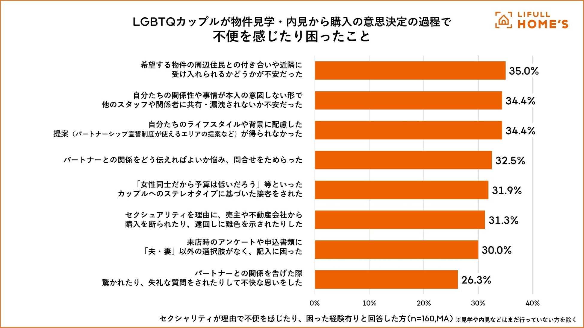 実際の対応を受けた際に「『女性同士だから予算は低いだろう』等のカップルへのステレオタイプに基づいた接客をされた(32.5%)」や「セクシャリティを理由に、売主や不動産会社から購入を断られたり、遠回しに難色を示されたりした(31.3%)」など、不快な経験をした当事者もいました。