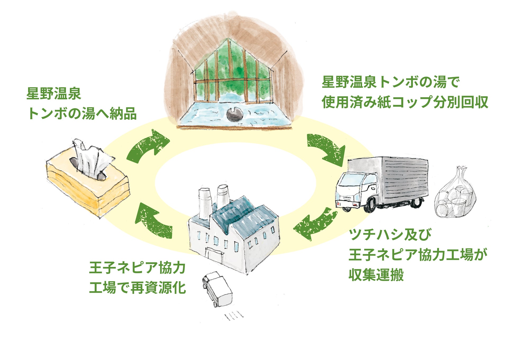 トンボの湯で回収された紙コップは、株式会社ツチハシ(長野県茅野市、代表取締役:土橋英一、以下、ツチハシ)の定期便(毎週木曜日)で運搬され、王子ネピア協力工場へ搬入されます。ここで、資源を効率的に回収しハンドタオルへ再資源化され、トンボの湯へ納品されます。星野リゾート、王子ホールディングス、王子ネピア、ツチハシにとって初の取り組みです。