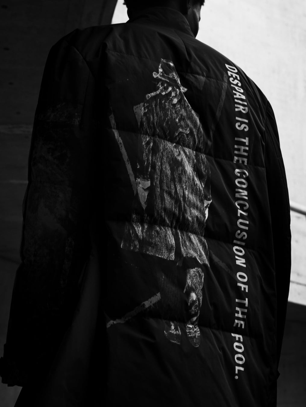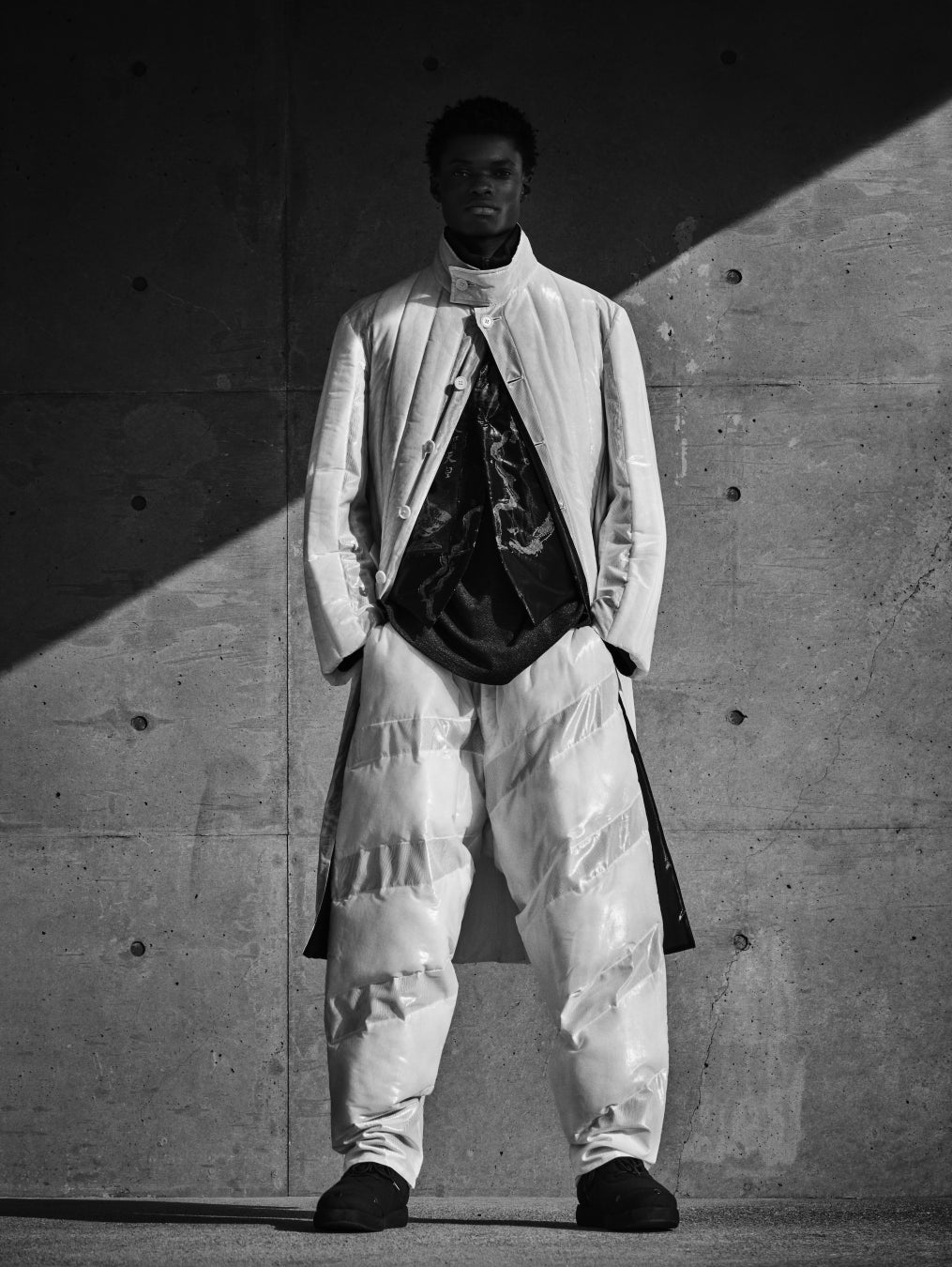 折りたたむことと広げることは、Yohji Yamamoto POUR HOMME 2025-26 A/W コレクションのクリエイションにおける鍵となる。可逆性は、コレクション全体の象徴となる、外観と質感を変化させることのできる、精巧に作られた一連のリバーシブルのコートを通して、自らを明らかにしている。