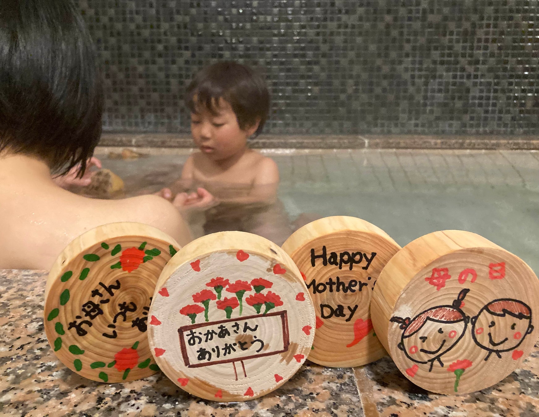 5月10日から5月19日の期間、地元ときがわ町の学童保育 ひまわりクラブの子供たちが地域の身近な女性に向けてありがとうメッセージを記入したヒノキ入浴木がお風呂に浮かびます。ヒノキには、ときがわ町の「間伐材」を使用します。温泉道場は「おふろから文化を発信する」を企業理念に掲げており、間伐材の積極的活用を通じて、地域の森林整備について意識する機会になればと考えます。