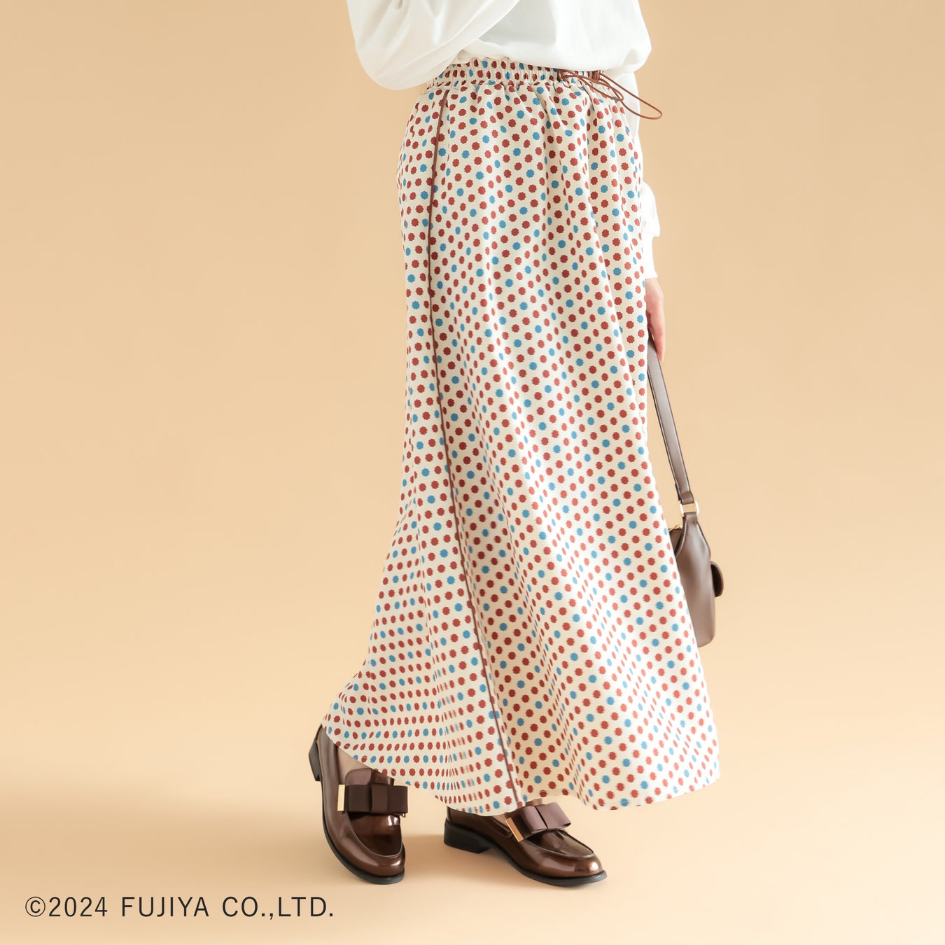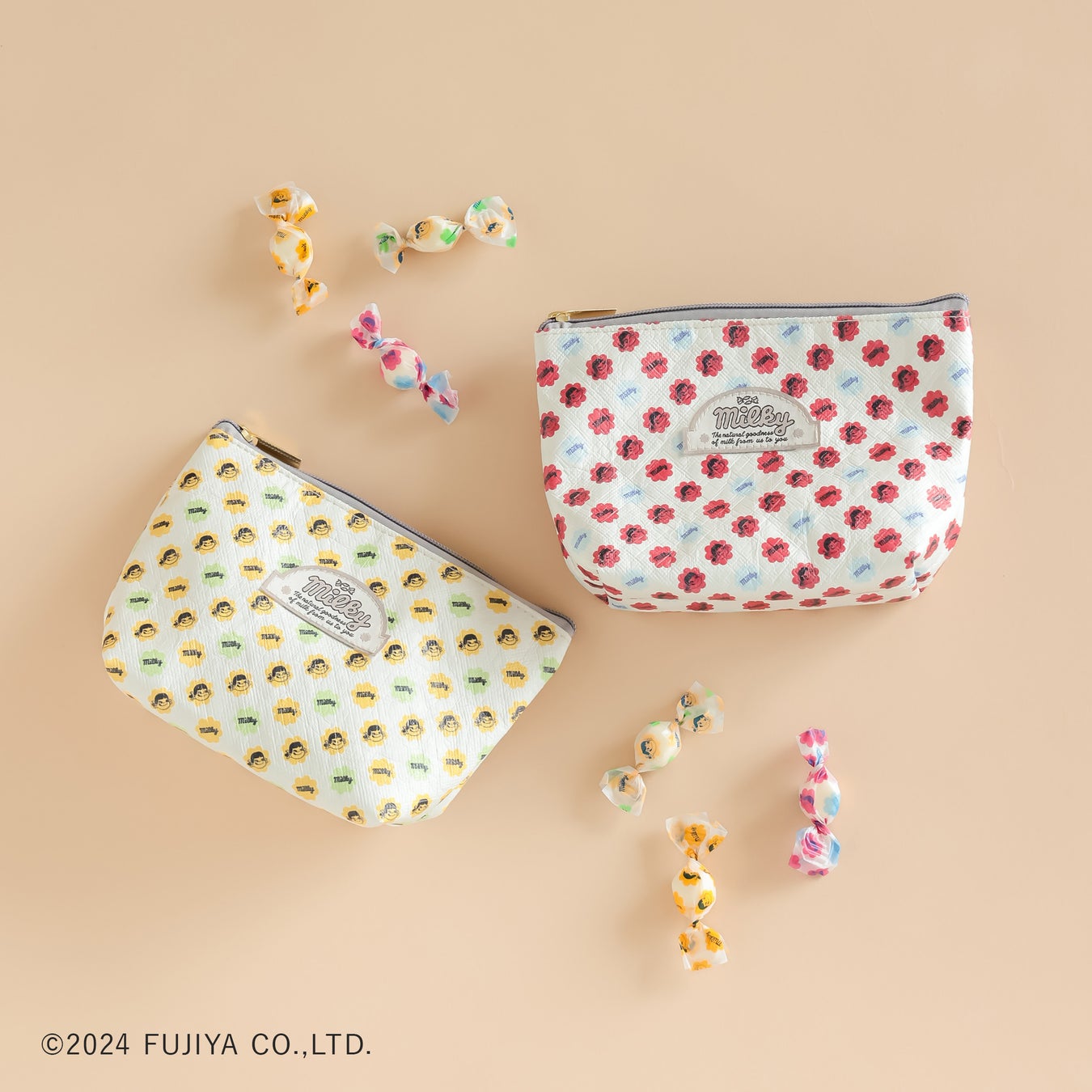 中でも注目アイテムは、ミルクキャンディー「ミルキー」の包み紙のフラワーモチーフを取り入れた3アイテム。総柄のスカートは、すこしレトロな雰囲気が漂うアイテムに仕上げました。また、トートバッグとポーチは、実際の包み紙と同じカラー展開でご用意しております。