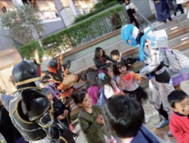 コスプレイヤーがお子様の来園者にお菓子を配布します。