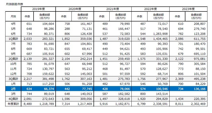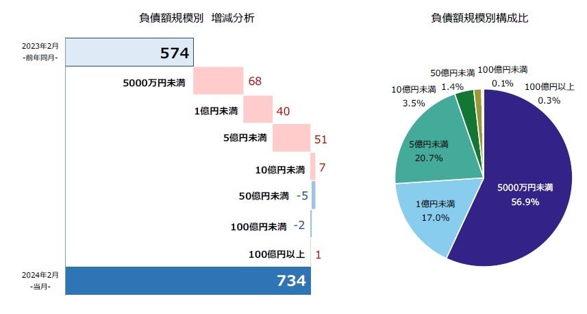 負債総額は1361億6600万円(前年同月1005億4600万円、35.4%増)。3カ月連続で前年同月を上回り、2月としては4年連続で前年同月を上回った