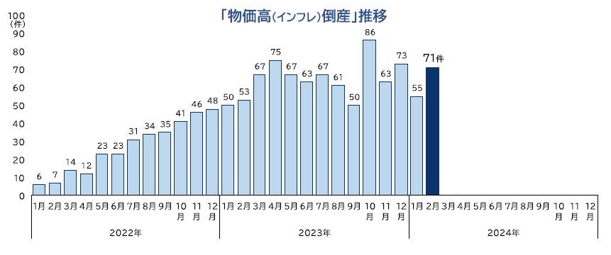 「物価高(インフレ)倒産」は、2024年2月に71件(前年同月53件、34.0%増)発生した。23年10月(86件)がピークとなり、「物価高」直撃の影響は緩和されつつあるものの、高止まりの水準が続いた。このうち、十分な価格転嫁ができず経営破綻に至った「値上げ難型」の物価高倒産は24年2月に6件発生した。