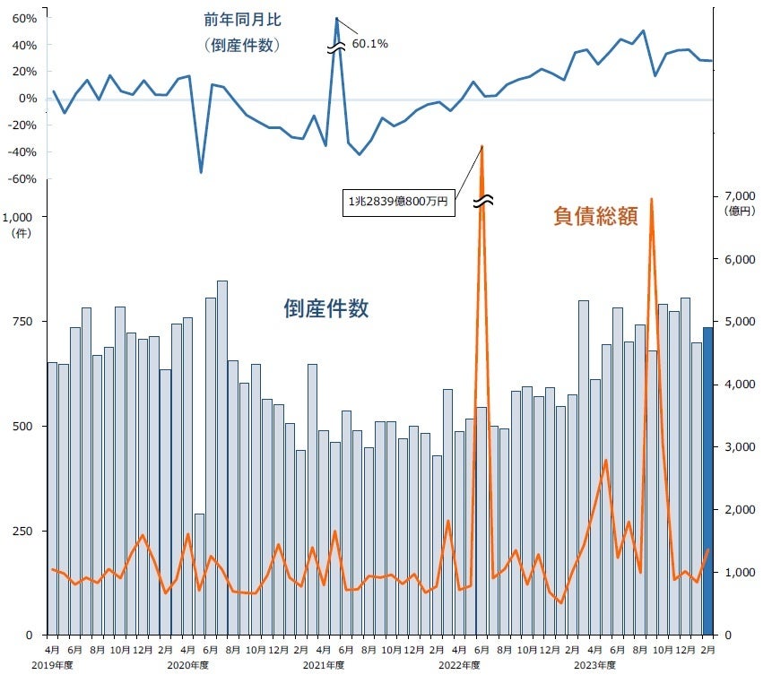 倒産件数は734件(前年同月574件、27.9%増)と、22カ月連続で前年同月を上回った。前年同月より160件多く、2月としては過去10年で最多となった。2023年4月-2024年2月の累計は8011件と、2022年度(6799件)を17.8%(1212件)上回った