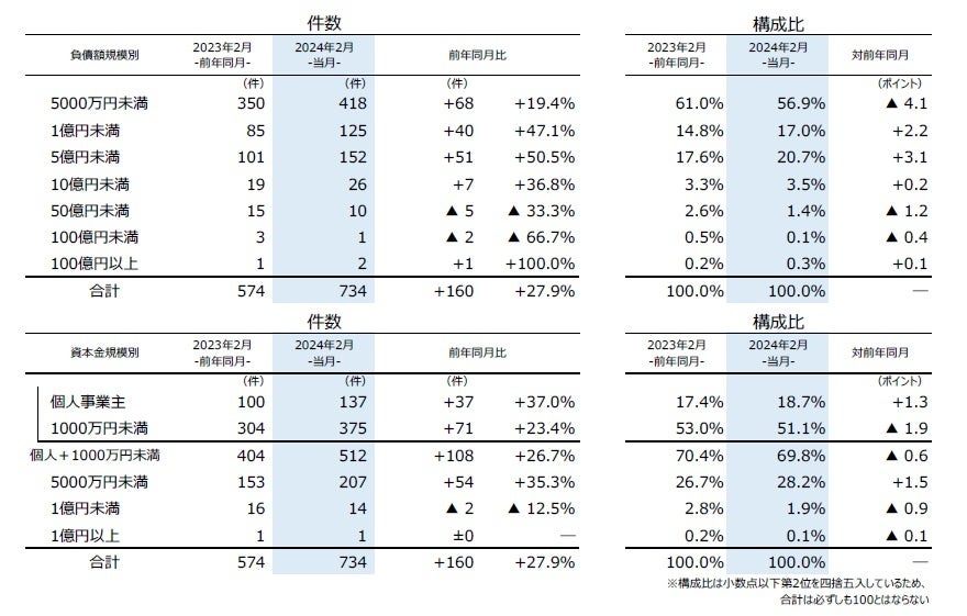 2024年2月の企業倒産は734件発生し、前年同月(574件)を27.9%(160件)上回った。2022年5月から22カ月連続で前年同月を上回り、2月としては2014年(765件)以来10年ぶりに700件台となった。中小規模の事業者を中心に、物価高や人手不足、コロナ支援策縮小の影響を複合的に受けた倒産が増えた。