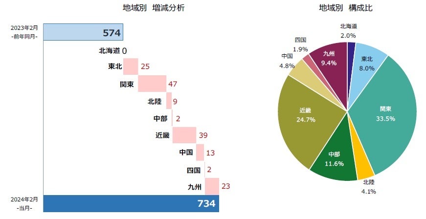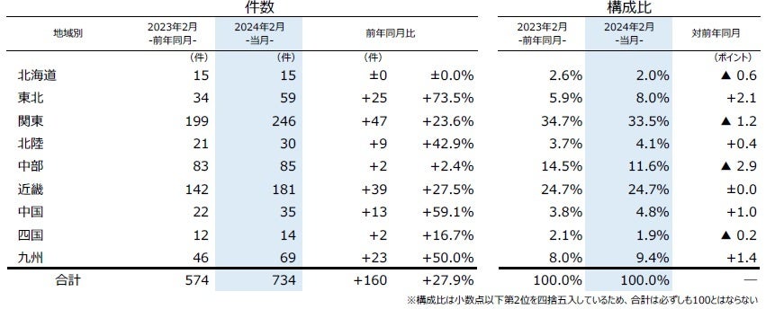 件数別では、『関東』(前年同月199件→246件、23.6%増)がトップ。「東京」(同96件→119件)は13カ月連続で前年同月を上回った。『北陸』(同21件→30件、42.9%増)は、「石川」が1件から8件と大幅に増加した。『九州』(同46件→69件、50.0%増)は、2月としては、2009年(73件)以来の水準となった。