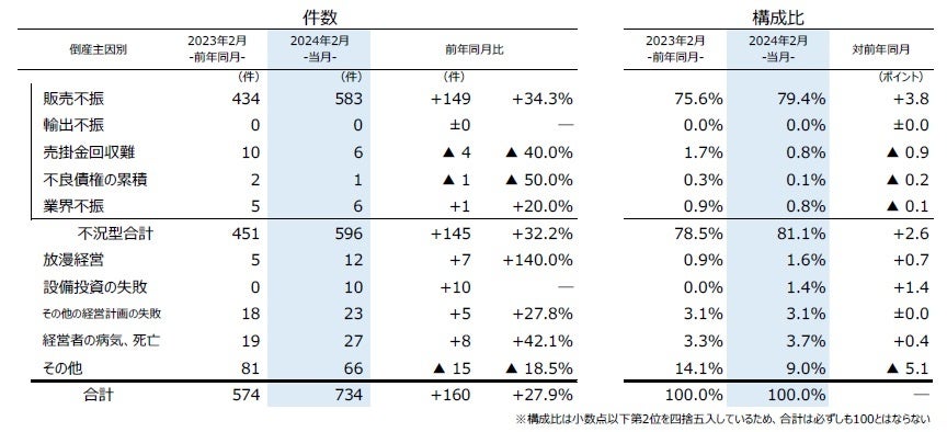 主因別にみると、「販売不振」が583件(前年同月434件、34.3%増)で最も多く、全体の79.4%(対前年同月3.8ポイント増)を占めた。内訳を業種別にみると、「小売業」(前年同月101件→138件、36.6%増)が最も多く、「サービス業」(同99件→136件、37.4%増)が続いた。「業界不振」(同5件→6件、20.0%増)などを含めた『不況型倒産』の合計は596件(同451件、32.2%増)となり、22カ月連続で前年同月を上回った。