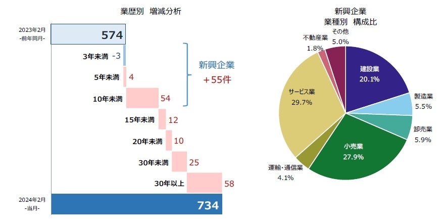 業歴10年未満の『新興企業』[「3年未満」(前年同月27件→24件、11.1%減)、「5年未満」(同40件→44件、10.0%増)、「10年未満」(同97件→151件、55.7%増)]は219件(前年同月164件、33.5%増)と、24カ月連続で前年同月を上回った。内訳を業種別にみると、「サービス業」(同56件→65件、16.1%増)が最多、「小売業」(同41件→61件、48.8%増)、「建設業」(同27件→44件、63.0%増)が続いた。