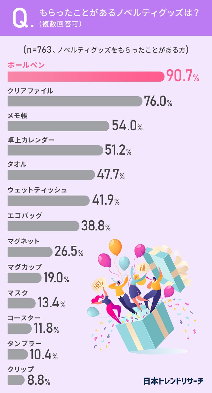 また、もらったことがあるノベルティグッズは「ボールペン」が90.7%、次いで「クリアファイル」が76%となっていました。