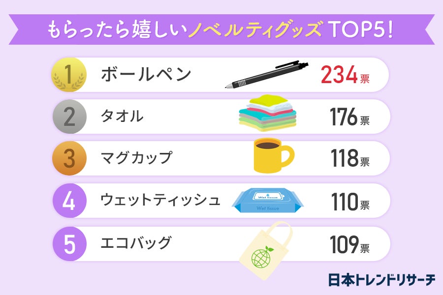 もらったら嬉しいノベルティグッズ第1位は「ボールペン」となっており、ほかにもタオルなど実用的な物が上位にランクインしています。