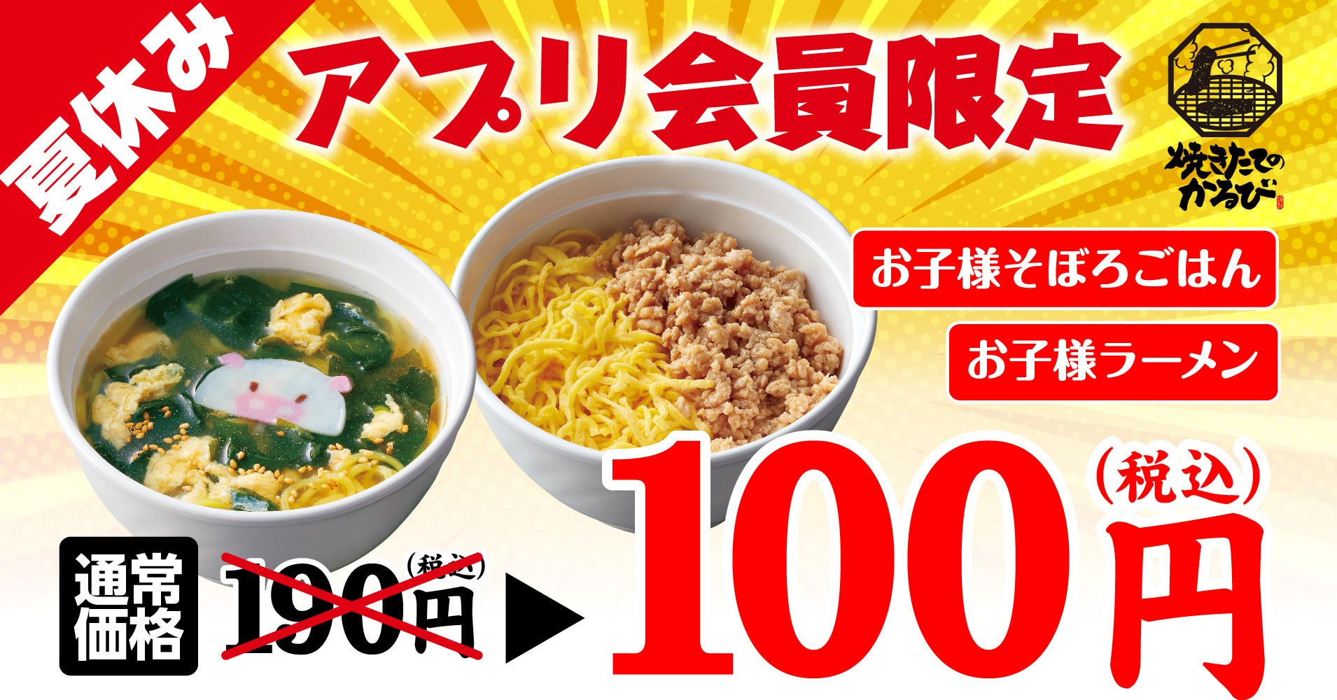 【焼きたてのかるび】「おこさまメニュー」が100円!夏限定アプリクーポンを8月9日(金)より配信開始
