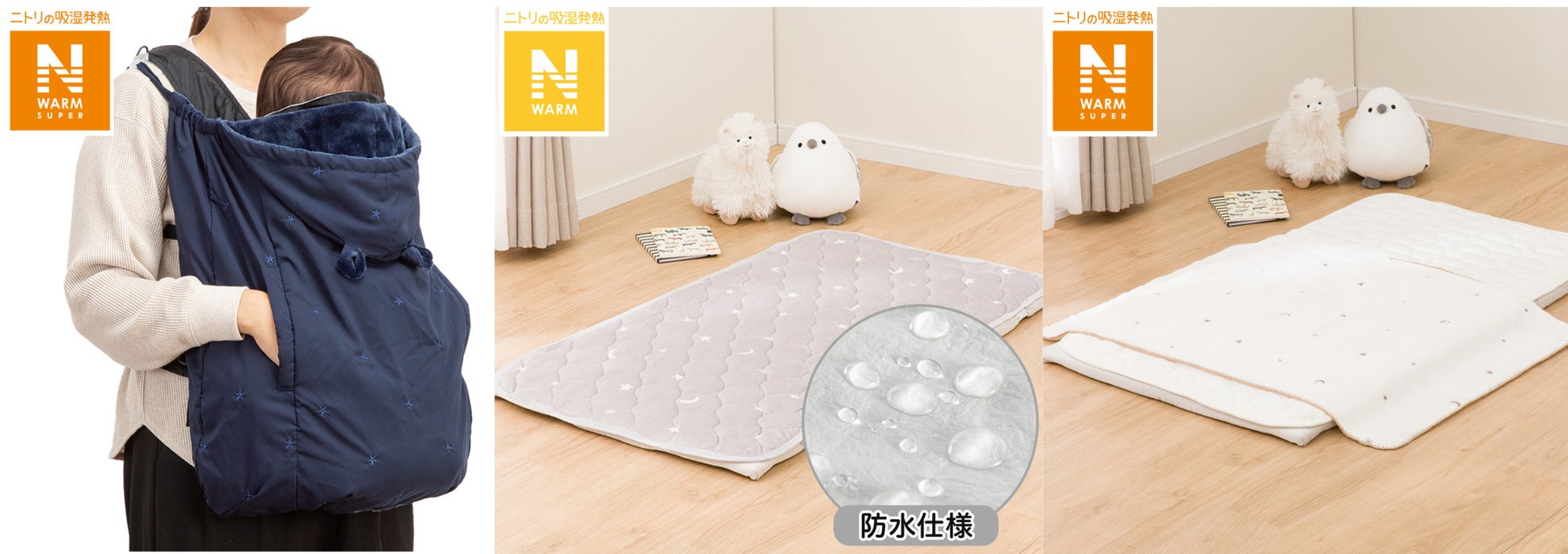 ニトリでは、「よりあたたかく快適に、少しでも育児をラクに楽しく過ごして欲しい」という想いから、様々な機能を加えたぬくぬくかわいいベビー用のNウォームアイテムをご用意いたしました。