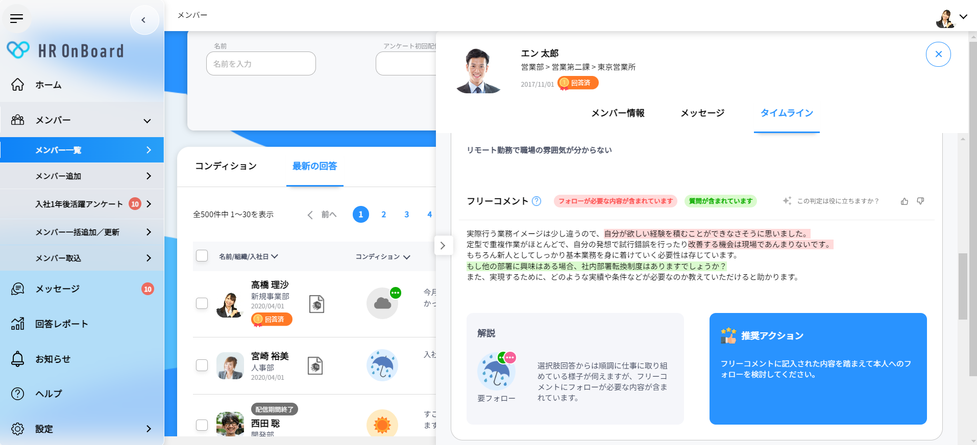 フリーコメントから、離職につながるリスクのあるコメントについては赤色でハイライト。質問については緑色でハイライトし、一目でチェックすることが可能です。