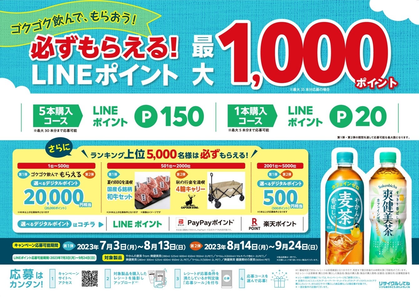 「やかんの麦茶」など、対象製品を“ゴクゴク”飲めば飲むほど応募できるレシートキャンペーンを実施。対象製品を購入したレシート、もしくはECサイトなどで購入した納品書・領収書を撮影して応募すると、最大1,000ポイント*¹分のLINEポイントが必ずもらえます。さらに、キャンペーン期間中の購入本数上位5,000名様は、その順位に応じて、選べるデジタルポイントや、ゴクゴク飲みたくなるシーンにぴったりな賞品が必ずもらえます*²。対象製品を飲めば飲むほど賞品がもらえるチャンスが広がる、ランキング形式のキャンペーンです。