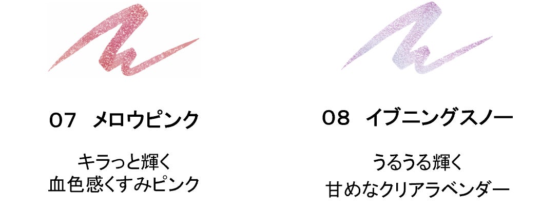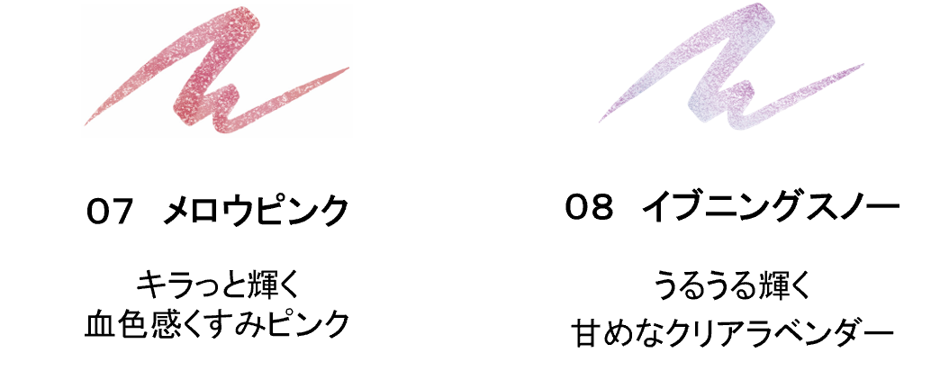 大人気の「ヒロインメイク プライムリキッドアイライナー リッチジュエル」から、繊細なラメ感と血色感のあるくすみピンク「07 メロウピンク」とリッチなラメ感のラベンダーカラー「08 イブニングスノー」が数量限定発売。