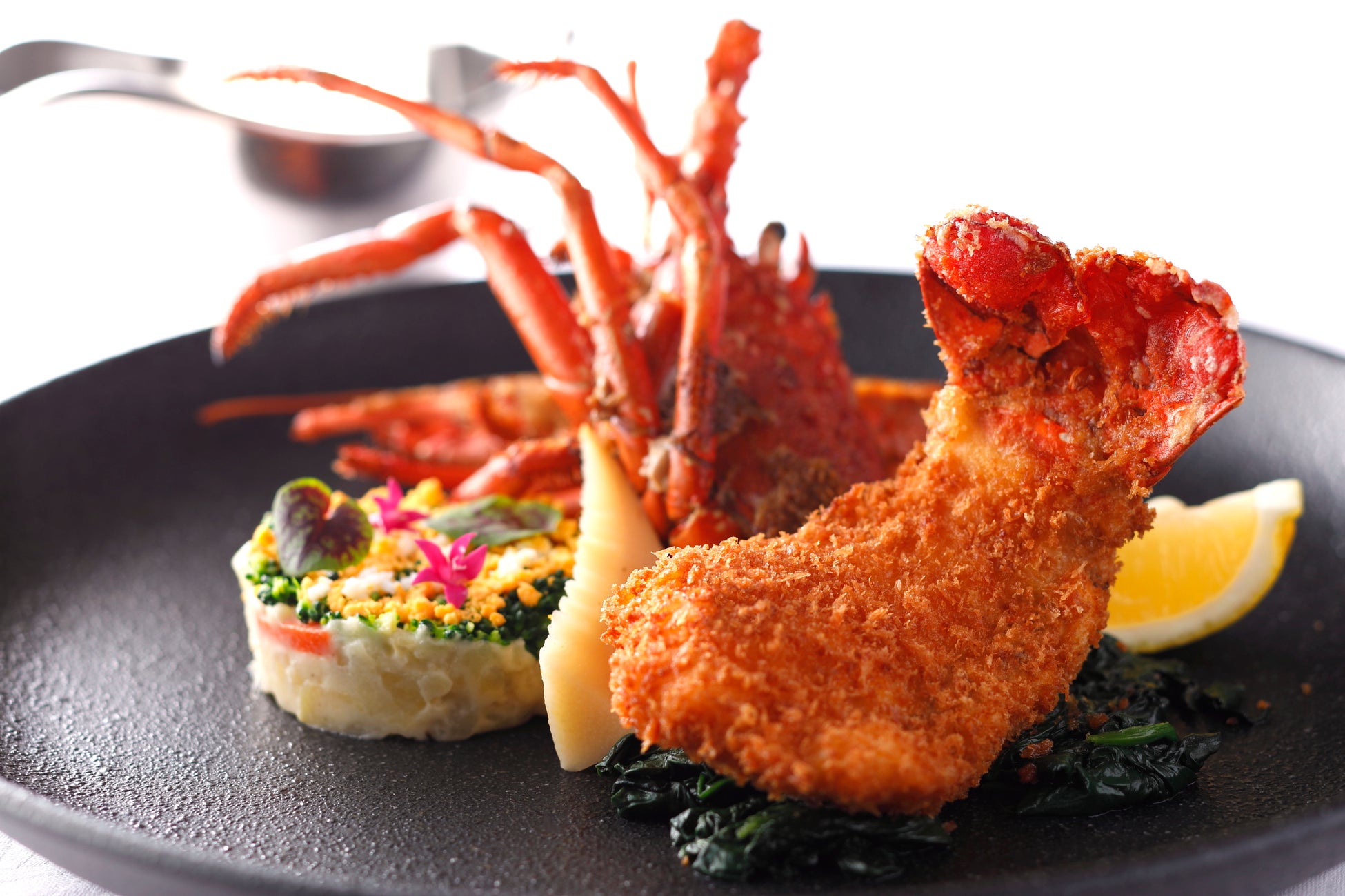 伊勢海老を一尾丸々フライにすることで、海老のエキスを損なわず仕上げました。豪快なまでの海老のプリプリとした食感とたっぷりの旨味をご堪能いただける一品です。エレガントな味わいの自家製ポテトサラダにミモザで彩りを添え、春らしさを演出しています。