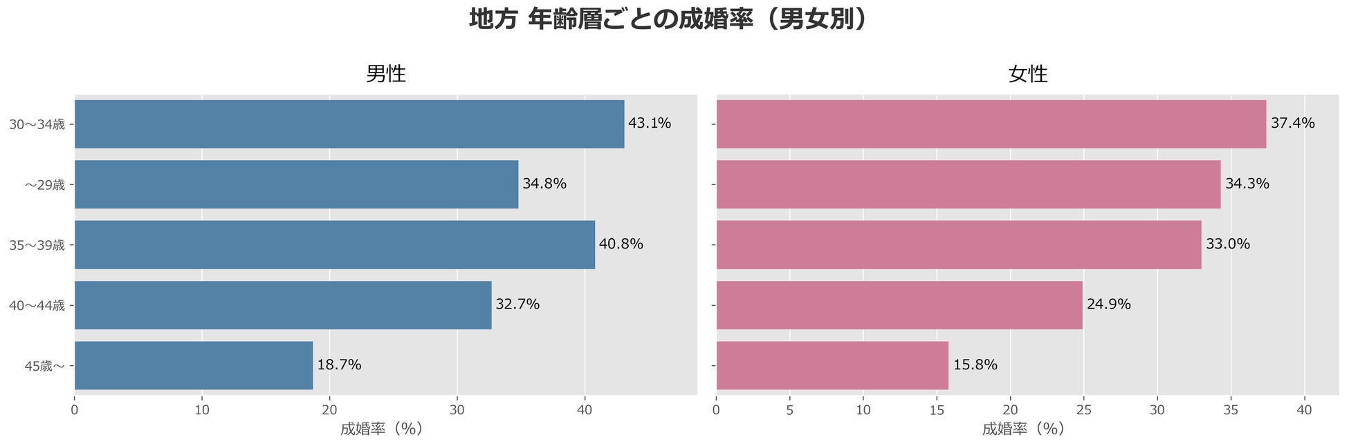 都市と地方における年齢層ごとの成婚率を比較したところ、男性は全年齢層で都市部の方が成婚率が高い傾向にありました。年齢による傾向の違いは、都市・地方間で大きな差は見られませんでした。