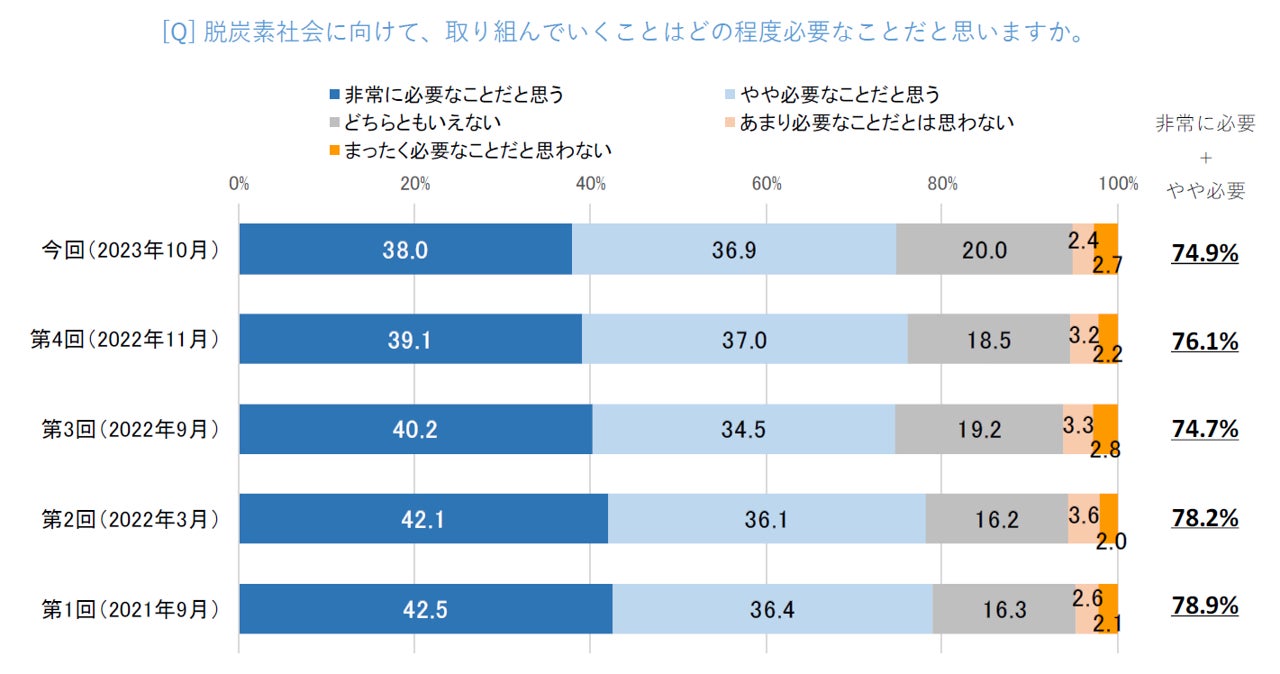 ・脱炭素社会に向けた取り組みがどの程度必要だと思うか聞いたところ、「必要(非常に必要+やや必要)」と回答した人は74.9%で、前回の76.1%から微減。「非常に必要」の回答は第1回から減少し続け、過去最低値に。