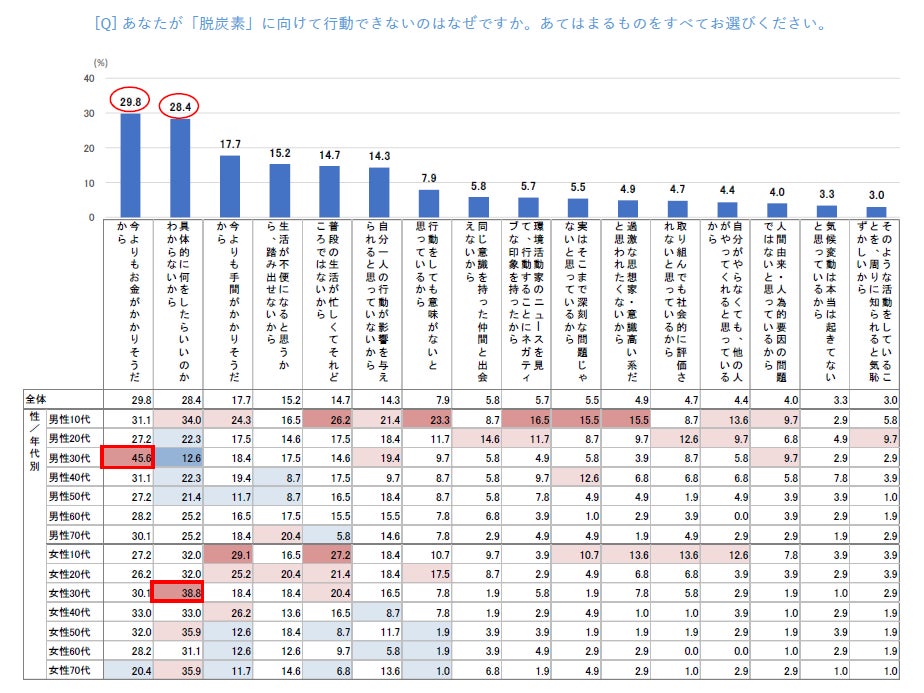 ・脱炭素に向けて行動しない理由をきいたところ、「今よりもお金がかかりそうだから」(29.8%)がトップ。次いで、「具体的に何をしたらいいのかわからないから」(28.4%)。