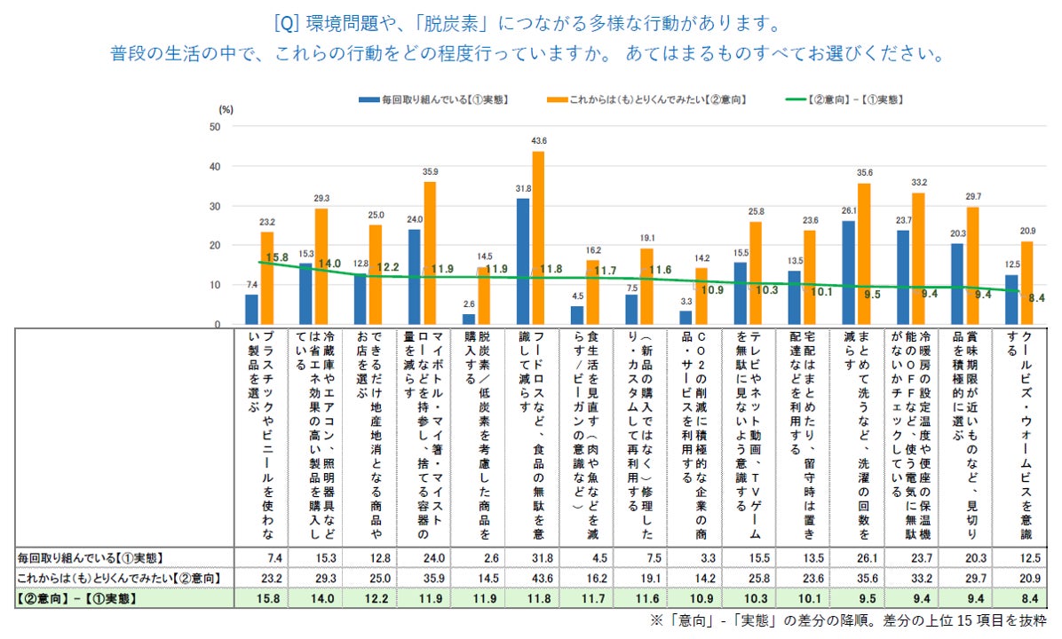 ・脱炭素に向けた取り組みの実態と今後の意向を聞き、その差分をみたところ、「プラスチックやビニールを使わない製品を選ぶ」(差分15.8ポイント、以下pt)、「冷蔵庫やエアコン、照明器具などは省エネ効果の高い製品を購入」(14.0pt)、「できるだけ地産地消となる商品やお店を選ぶ」(12.2pt)などの意向が、現在の取り組み実態よりも12~16pt近く高くなっており、これらの行動はきっかけがあれば顕在化する可能性が高いと推測できます。