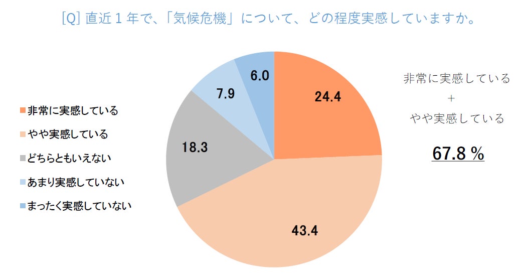 ・直近1年の間に「気候危機を実感した(非常に実感+やや実感)」と回答した人は67.8%にのぼり、「非常に実感している」は24.4%となりました。