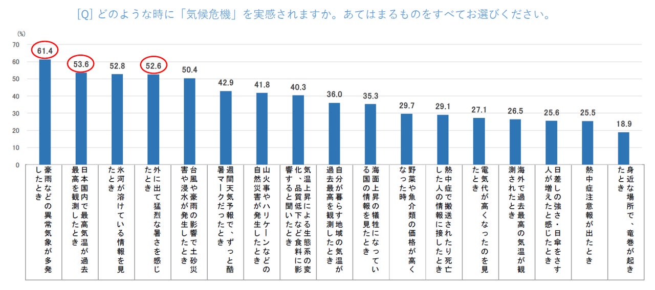 ・気候危機を実感するタイミングとしては、「豪雨などの異常気象が多発したとき」(61.4%)、「日本国内で最高気温が過去最高を観測したとき」(53.6%)、「外に出て猛烈な暑さを感じたとき」(52.6%)など、日常生活の中で感じる異変が上位に挙がりました。