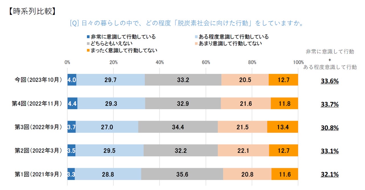 ■「脱炭素」に向けて行動している人は33.6%に留まり、2年前から変化せず。