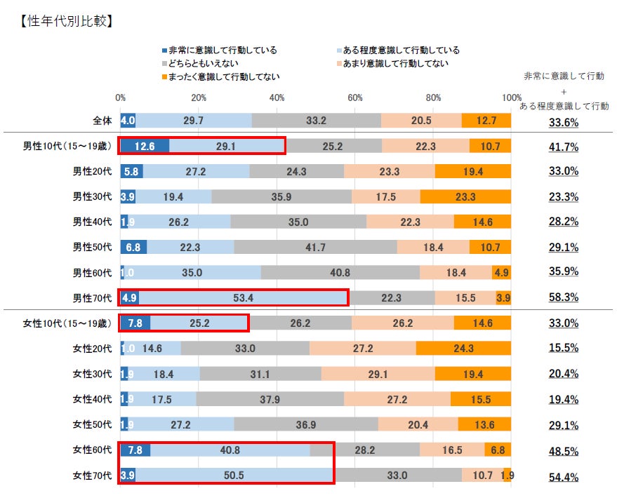 ・性年代別で比較したところ、「行動している」と回答した人は、70代男性と60~70代女性で約5~6割にのぼりました。若年層になるほど「行動していない」計が高くなる傾向ですが、10代(15~19歳)男女は「行動している」計が60~70代に次いで高く、若年層でも10代と20代では行動意識に大きな差があることがうかがえます。