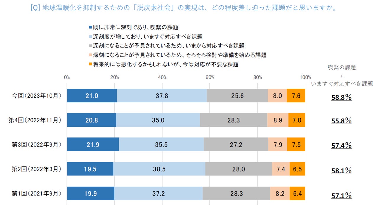 ・脱炭素社会の実現がどの程度差し迫った課題だと思うかについて、「すぐに対応すべき課題(非常に深刻であり喫緊の課題+深刻度が増しており今すぐ対応すべき課題)」であると回答した人は58.8%で、前回の 55.8%から微増。