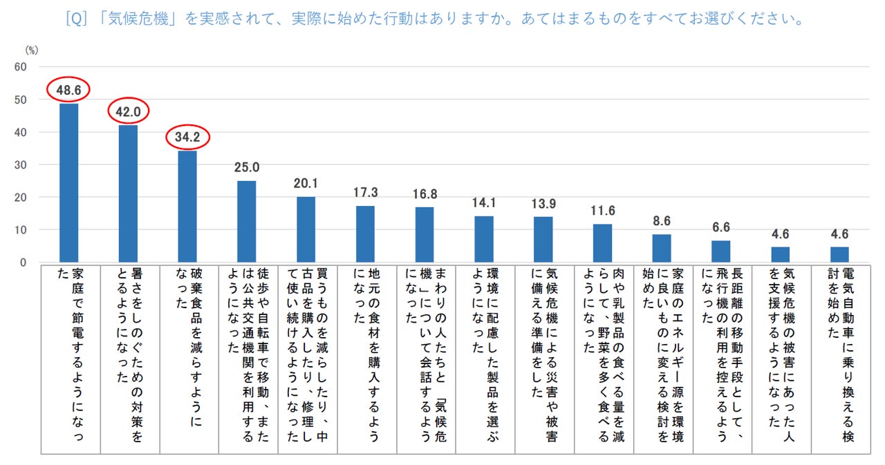 ・気候危機を実感して実際に始めた行動については、「家庭で節電するようになった」(48.6%)、「暑さをしのぐための対策をとるようになった」(42.0%)、「破棄食品を減らすようになった」(34.2%)など、日々の生活においてすぐに始められることから取り組んでいる人が多いようです。