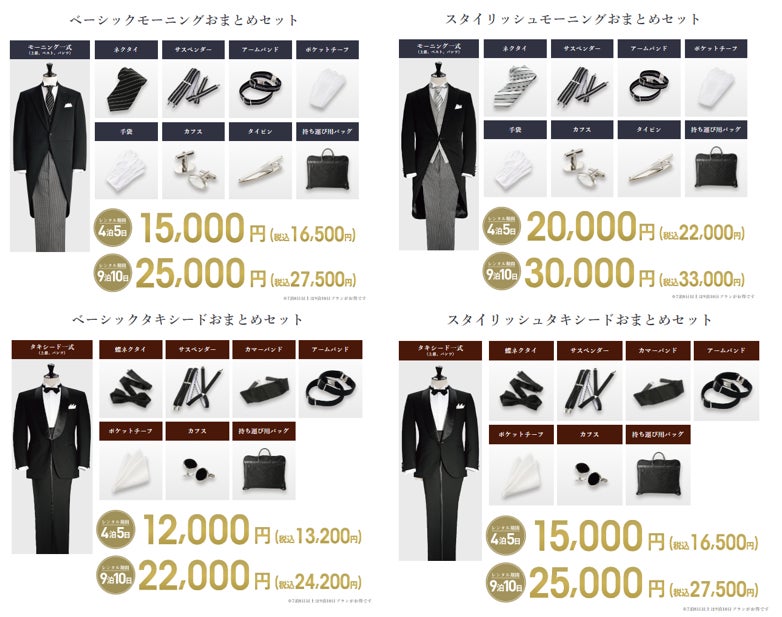 スタイリッシュラインは、従来のベーシックラインより細身で、よりフィット感が欲しい方や若い方におすすめです。パンツは、ワンタックからノータックへと変更。サイズも従来のA体より細身のY体から展開いたします。もちろん、9泊10日の「ロングレンタル」も可能で、今まで以上に、体型やお好みや期間に合わせて選びやすくなりました。
