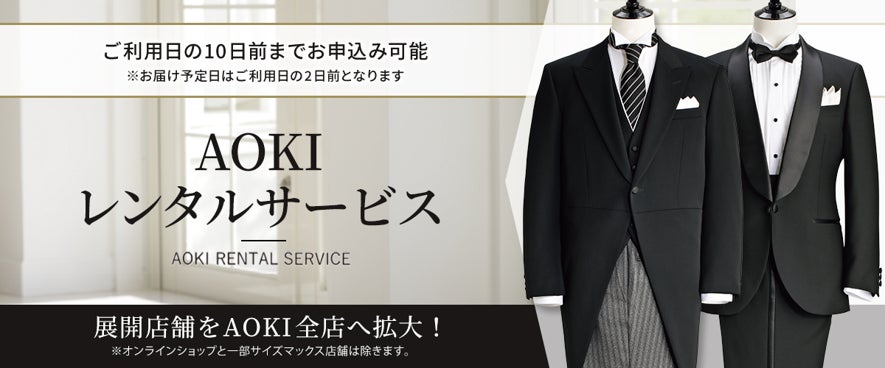 「ご利用日」の90日前から10日前までに店舗にてお申込みください。モーニング・タキシードの選択に加え、ベーシックライン・スタイリッシュラインを選べます。AOKIのスタイリストが最適なサイズをご案内いたします。