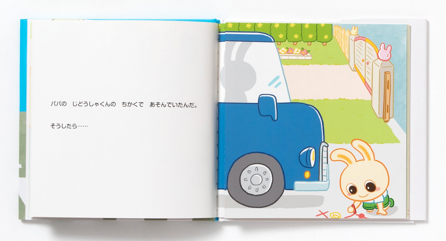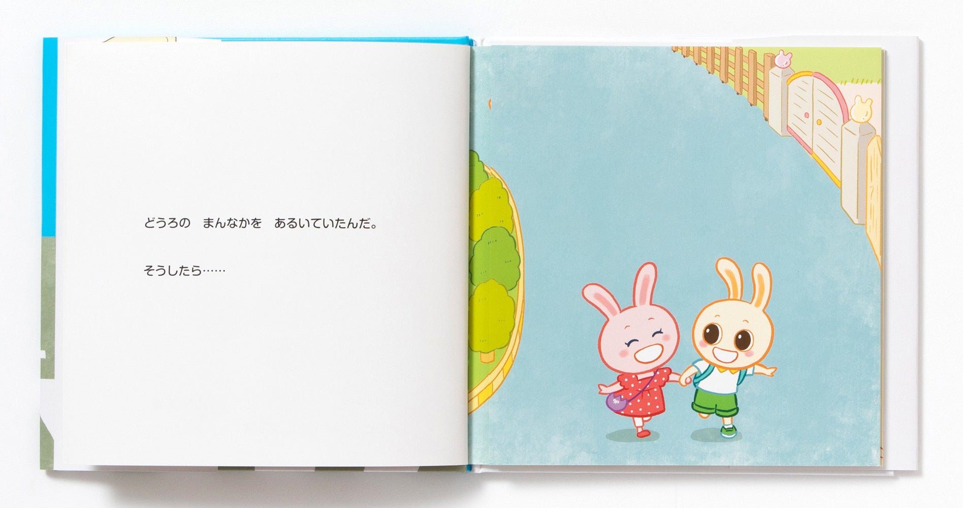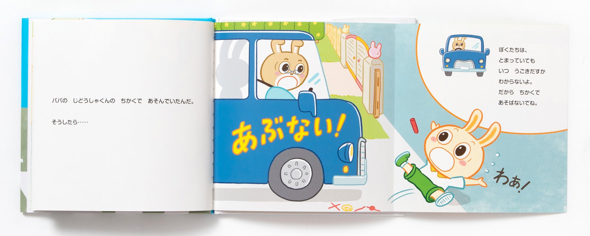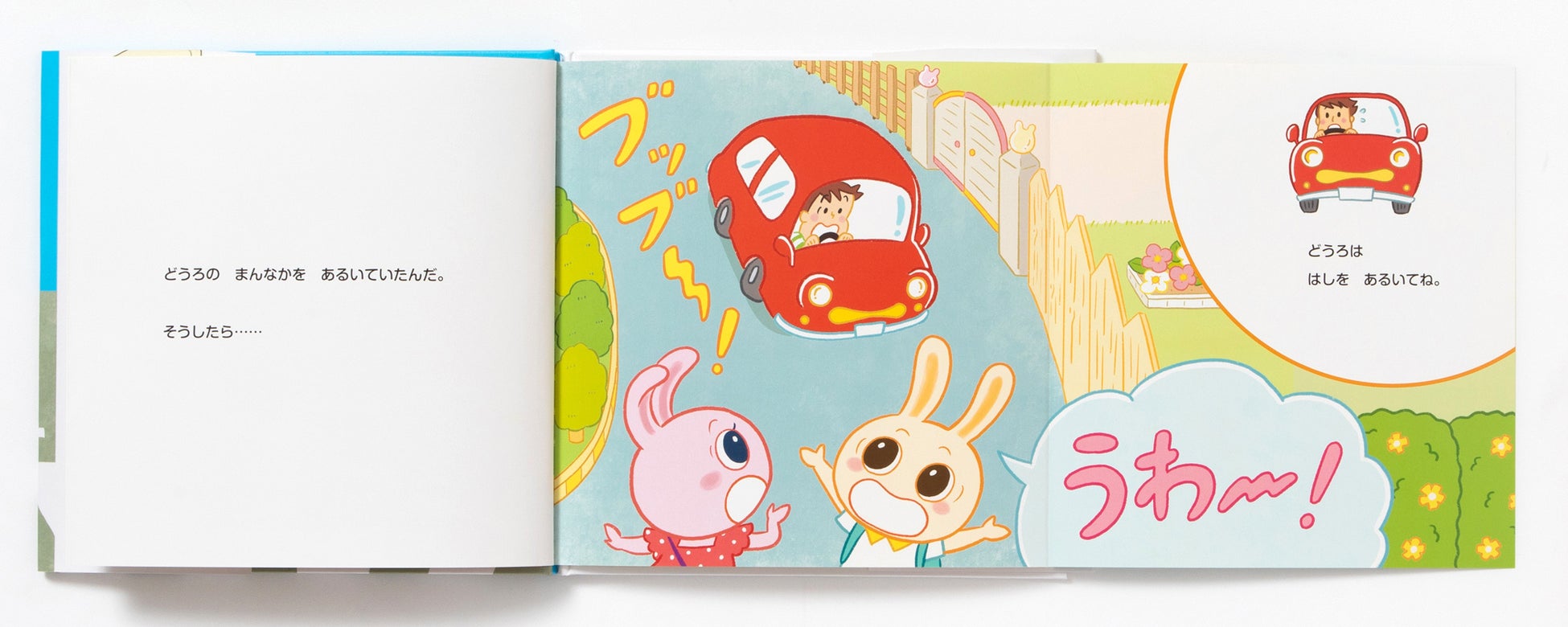うさぎのラビイとビットは自動車が大好き。でも、道路の真ん中を歩いていた時、道路に飛び出してしまった時、自動車の近くで遊んでいた時、自動車にひかれそうになりました。そんな時にどうすればよかったのか、「じどうしゃくん」が優しく教えてくれます。