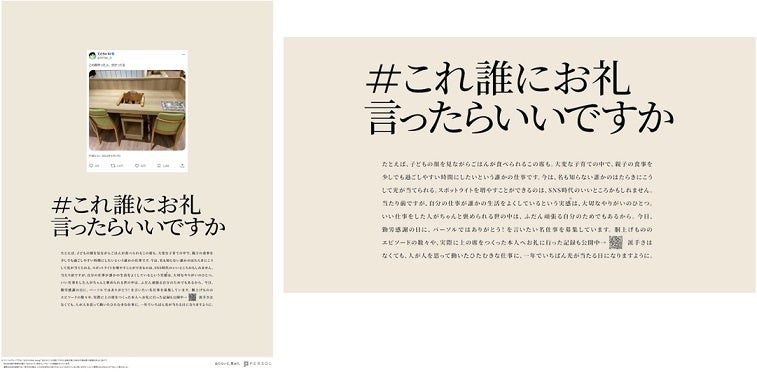 また、勤労感謝の日の当日には、日本経済新聞朝刊に本プロジェクトの開始を宣言する新聞広告を掲出。「ショッピングモールで子どもの顔を見ながら食事できる椅子を作った人への感謝」といった、SNS上に散らばる誰かの仕事に対する行き場のない感謝を紹介します。さらに、誰かの仕事に対する行き場のない感謝を集め、讃えるのみでなく、感謝を実際に本人まで届ける「お礼代行」アクションを実施することで、人々の“はたらくWell-being”の向上につなげていきます。皆さまには、ぜひ「#これ誰にお礼言ったらいいですか」のハッシュタグのもと、日常にあふれるいい仕事に対する感謝の気持ちを、X(旧Twitter)上で積極的に発信していただければ幸いです。