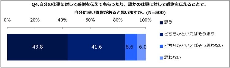 また、はたらく男女のうち、約85%が、感謝を伝えられる、もしくは誰かの仕事に感謝を伝えることで自分にとって良い影響があると考えていると回答しました。