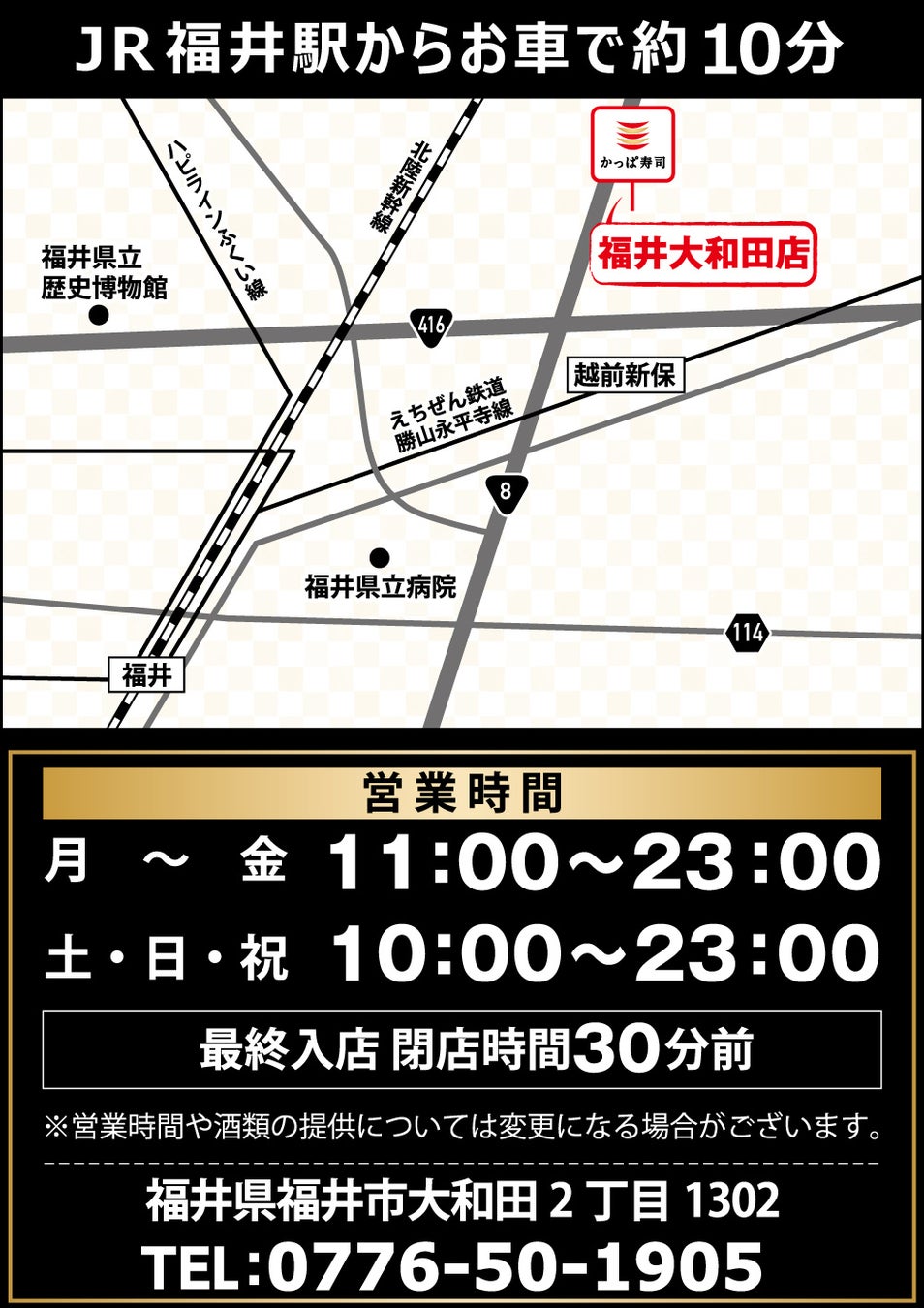 待望の福井県初出店!福井大和田店では珠玉の豪華ネタから、手軽に楽しめる定番ネタ、さらに有名店とのコラボ商品・本格スイーツまで、豊富なラインナップをご用意して地域の皆様から親しまれるお店作りに努めてまいります。福井大和田店のオープン情報は今後随時公開予定です。