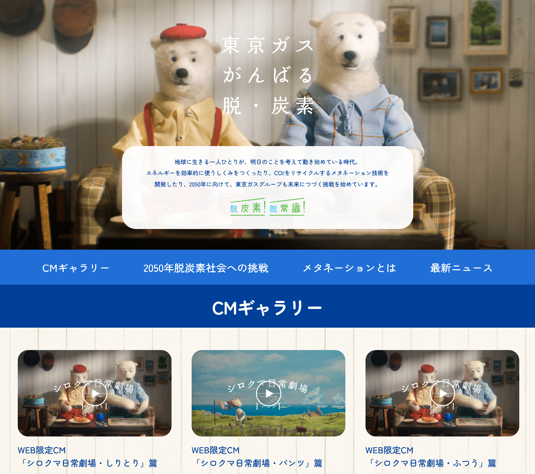 本CMは、2頭のシロクマの「しりとり」を通じて地球温暖化への危機感を伝えるとともに、CO2をリサイクルする技術や東京ガスグループの脱炭素社会実現に向けた姿勢を伝える内容となっています。