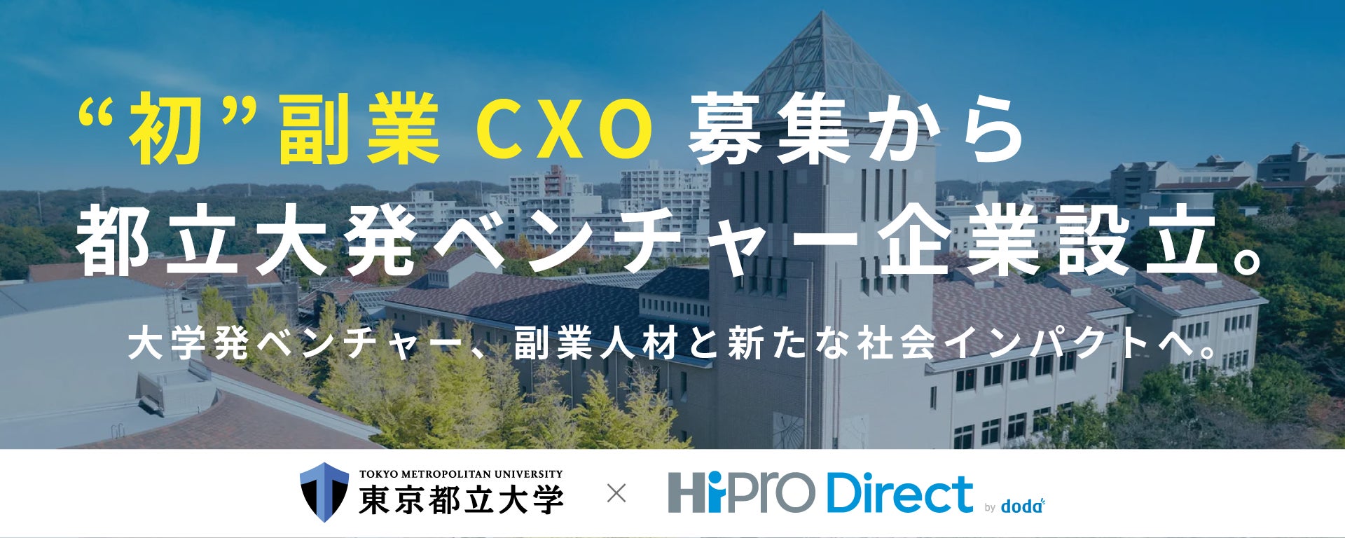 「HiPro Direct」は東京都立大学と連携し、2024年8月から10月の間に大学研究者とともに同大学発のベンチャー企業設立を支援する「CXO候補人材」を募集、289名の応募が集まりました。加えて当社は、事業化に求められる知見やフェーズごとに必要となる専門性の精査、応募者の選考、会社設立に向けたチームビルディングの課題確認、プロジェクトの進捗確認などをサポート。さらに、事業化のフェーズごとに求められる専門知識やスキル不足に対応するために、副業CXO以外の候補人材で形成するコミュニティの立ち上げも牽引しました。これらの取り組みにより、同大学としては初となる、副業CXOを活用してのベンチャー企業設立が実現しました。