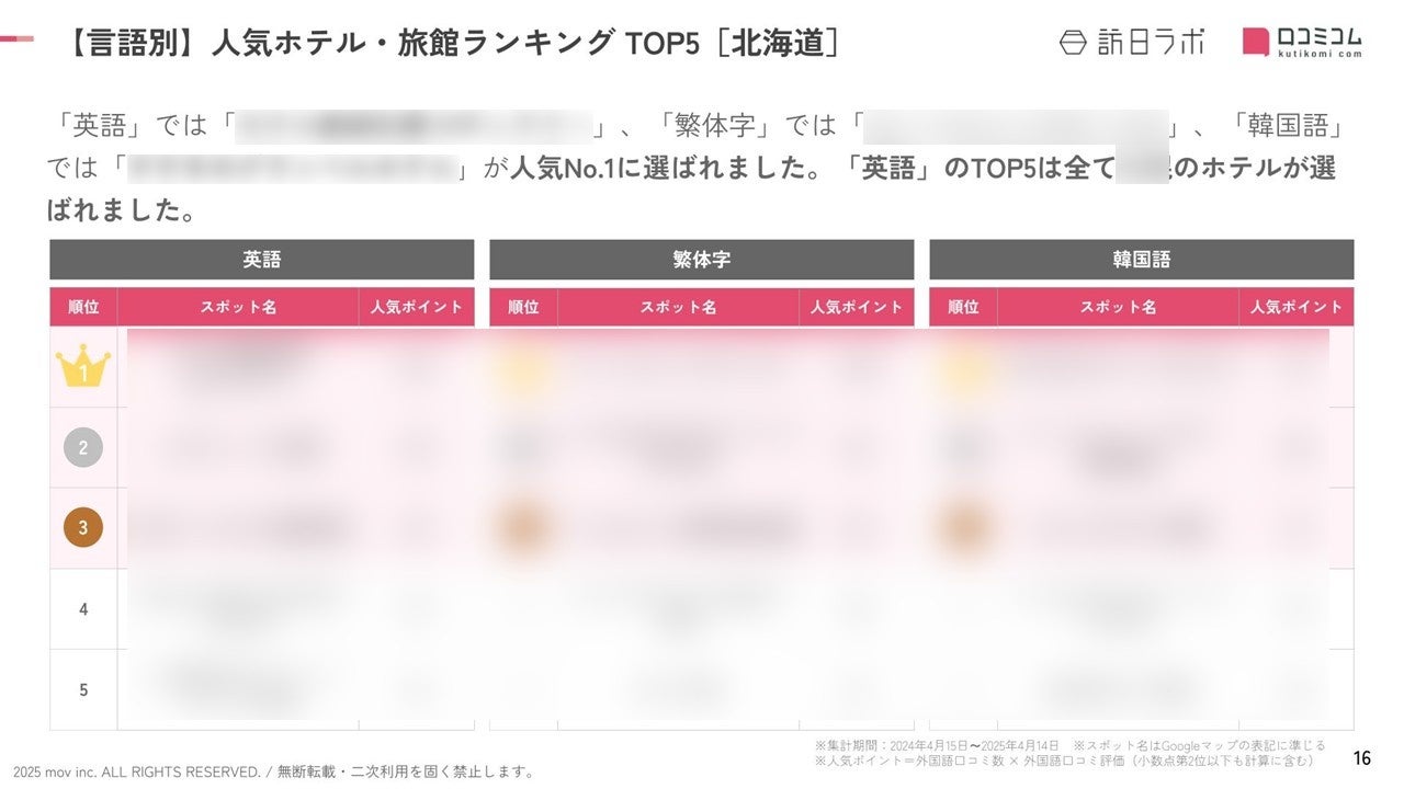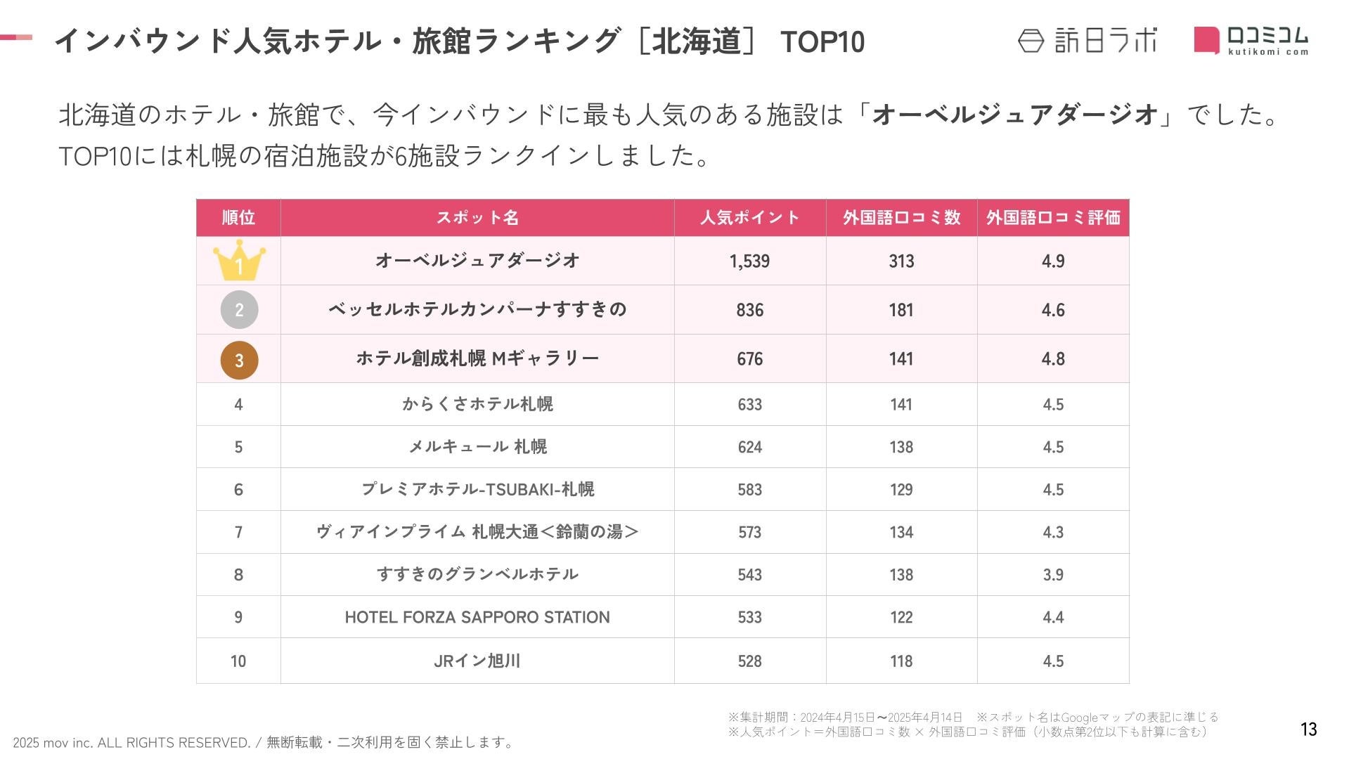 業界最大級のインバウンドビジネスメディア「訪日ラボ」及び 店舗向け集客一元化プラットフォーム「口コミコム」を運営する株式会社mov(代表取締役:渡邊 誠、本社:東京都渋谷区、以下mov)は、北海道のホテル・旅館に寄せられた最新の口コミデータから、独自の『インバウンド人気ホテル・旅館ランキング』を発表しました。