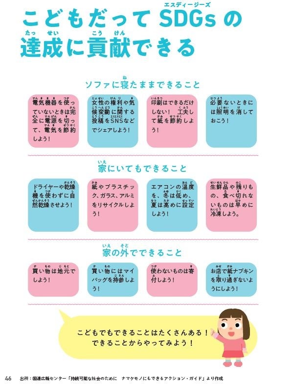 また、それぞれの項目ごとに「できることから始めよう!」というコーナーを設けています。ここでは「目標の達成のためにはどうしたらよいのか考えてみよう」「なぜこうした問題が起きているのか調べてみよう」といった問いかけを用意しています。このコーナーをきっかけに親子で話し合ったり、世界が抱えている問題について一緒に調べたりすることもできます。
