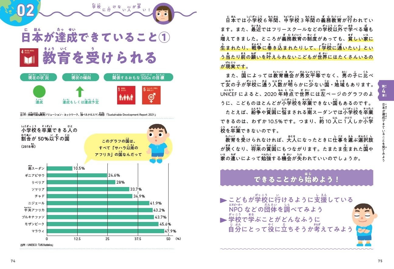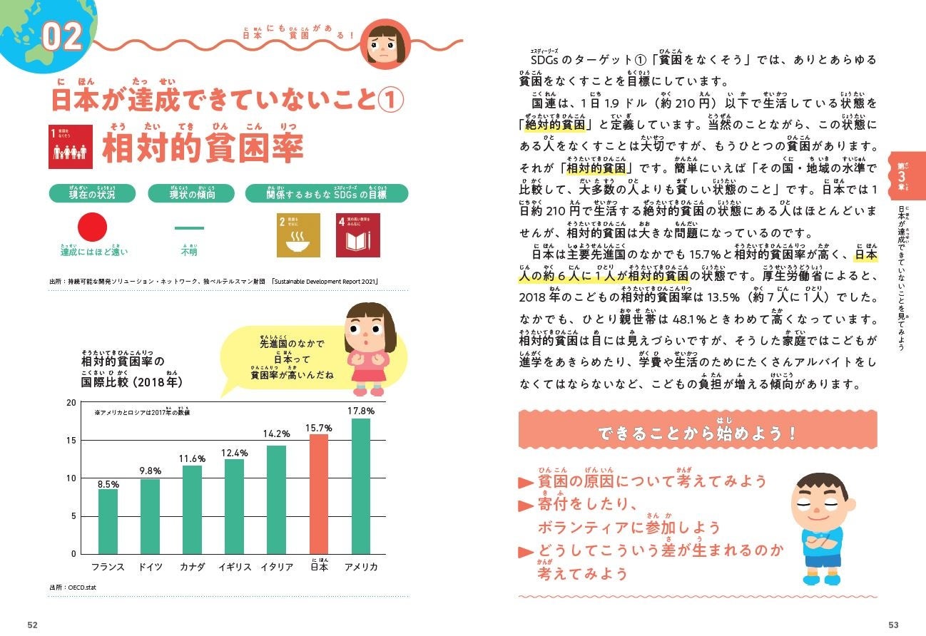 SDGsには17個の目標がありますが、日本が達成できているのはこのうちの3つしかありません。本書では、「達成できていること」「達成できていないこと」についてグラフや図表などを用いてわかりやすく解説しています。
