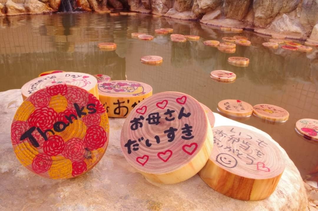 このイベントでは、地域の⼦どもたちやお客さま、店舗のスタッフがお母さんへの「ありがとう」の気持ちを記したヒノキの⼊浴⽊99個を女湯に浮かべます。湯船の中でお母さんへの気持ちが綴られたメッセージを読みながら、さわやかなヒノキの⾹りでリフレッシュ。⾝も⼼も温まったあとで、『100のありがとう』を完成させるのはお客さま。残り1つのメッセージは、お客様から⼤切な⽅へ直接伝えてください。
