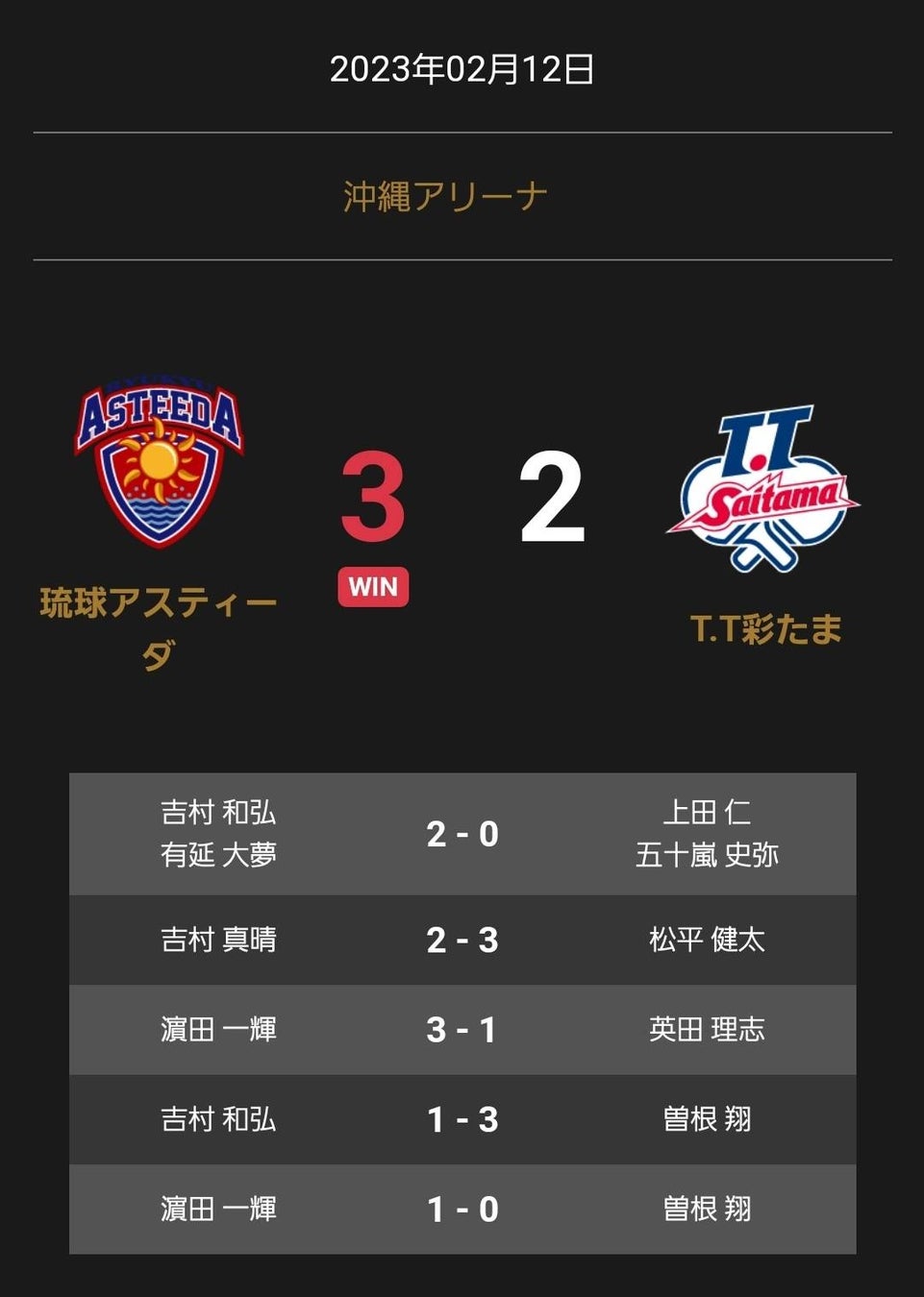 ノジマTリーグ 2022-2023シーズン 公式戦 2月12日開催 琉球アスティーダvsT.T彩たま 試合結果