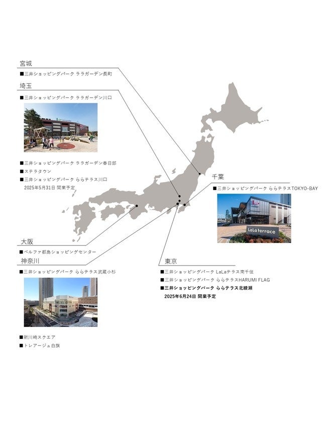 現在、「三井ショッピングパーク LaLaテラス南千住」(東京都荒川区、2004年開業)、「三井ショッピングパーク ららテラス武蔵小杉」(神奈川県川崎市、2014年開業)、「三井ショッピングパーク ららテラスTOKYO-BAY」(千葉県船橋市、2023年開業)、「三井ショッピングパーク ららテラスHARUMI FLAG」(東京都中央区、2024年開業)を運営しているほか、2025年5月31日(土)には「三井ショッピングパーク ららテラス川口」(埼玉県川口市)の開業を予定しております。
